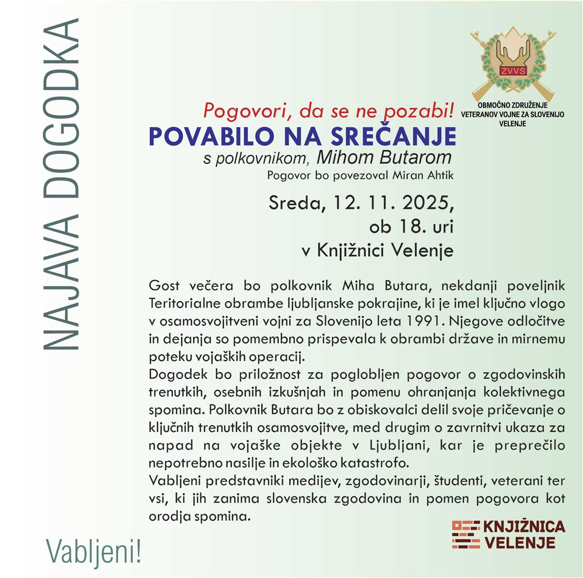 Vljudno Vas vabimo na dogodek, ki bo posvečen počastitvi poguma, predanosti in zgodovinskega pomena pripadnikov, ki so v času priprav in vključnih trenutkih slovenske osamosvojitve odigrali pomembno vlogo. Odkritje spominskega obeležja 1991.